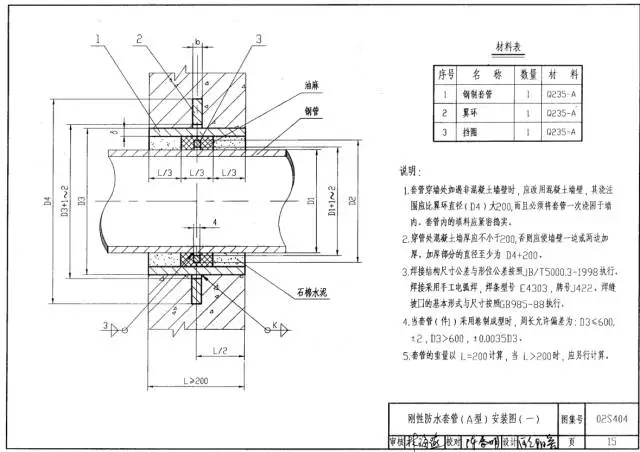穿線密閉套管說明:1、當(dāng)迎水面為腐蝕性介質(zhì)時(shí),可采用封堵材料將縫隙封堵;2.套管穿墻處如遇非混凝土墻壁時(shí),應(yīng)局部改用混凝土墻壁,其澆注范圍應(yīng)比翼環(huán)直徑(DS)大200,并且必須將套管一次澆固…